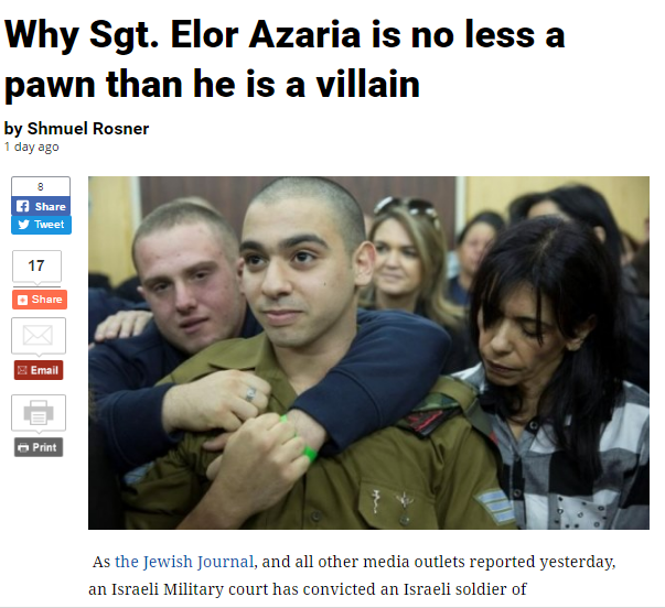 1.- Los hombros de Elor Azaria para el "affaire Azaria" son demasiado pequeños para llevarlo. Él es un joven soldado que cometió un serio y grave error. Él debe ser castigado por ello, pero difícilmente puede ser percibido como un ejemplo de nada.